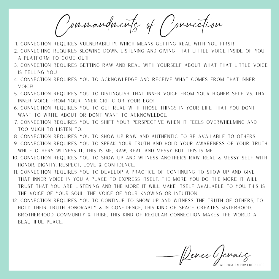These are not commandments in the traditional sense, a list of “thou shalt not”. These commandments are what it requires of us as individuals to fully show up in connection to ourself and to others. These commandments and the journey to showing up for them is the truest gift of Writing Wisdom. This practice connects us to ourself and to others when we show up fully in the requirements of these commandments of connection.